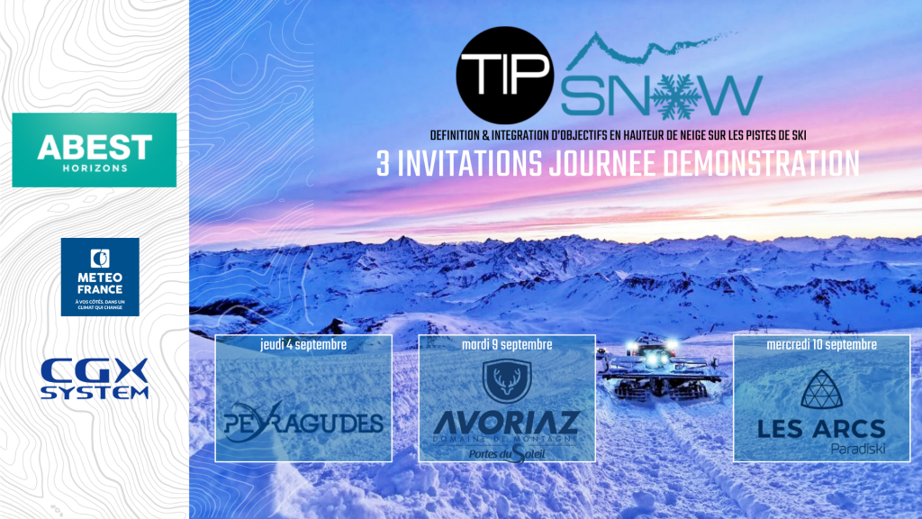 🚨 TIPSNOW en démo live au domaine ADS Domaine de Montagne Les Arcs / Peisey-Vallandry lundi 08 juillet 2024 🚨 📢 Nous vous invitons à une journée de démonstration de l’outil TIPSNOW !! 📢 Vous ne connaissez pas encore cet outil innovant de data de simulation ? Ce projet, porté par le consortium Groupe ABEST– Dia4s,…